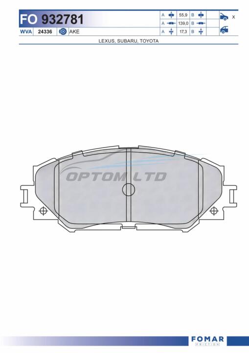 Колодки тормозные дисковые передние TOYOTA AURIS 1.4-2.2D 07-,COROLLA 1.4VVT-I 02-, URBAN CRUISER 09-,V FOMAR