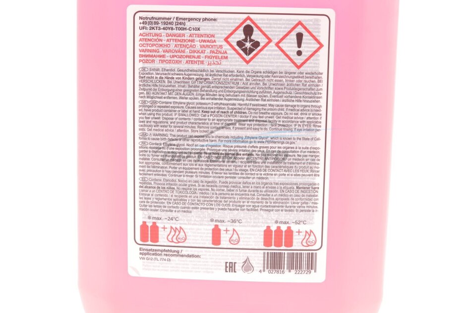 Антифриз являє собою засіб, що забезпечує захист від замерзання та корозії для всіх двигунів внутрішнього згоряння з рідинним охолодженням з блоком циліндрів із сірого чавуну або алюмінієвого сплаву, що відповідає вимогам VW, Audi, Seat та Skoda з такими властивостями: